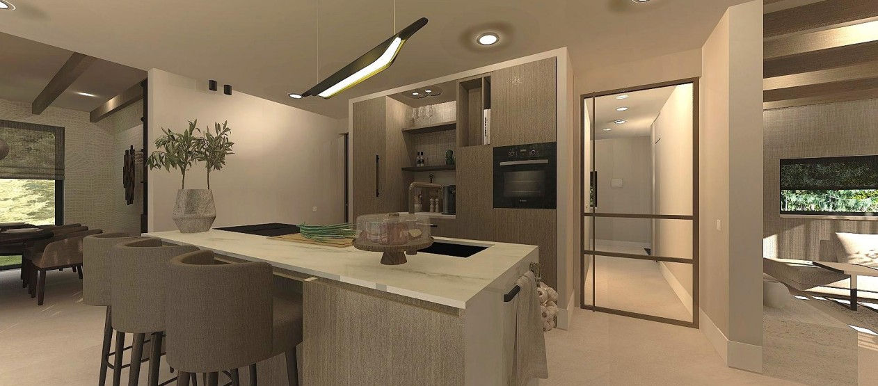De open leefkeuken vormt het hart van het huis en staat in directe verbinding met het terras, de eetkamer en de knusse zithoek met veel zicht op de tuin.